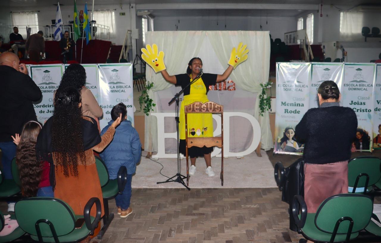 A programação foi cuidadosamente preparada para alcançar todas as faixas etárias com lições significativas. Logo no início, a irmã Danieli indagou à professora Cássia o que era louvor. A partir disso, aprendemos juntos sobre o tema e adoramos ao nosso Deus.
