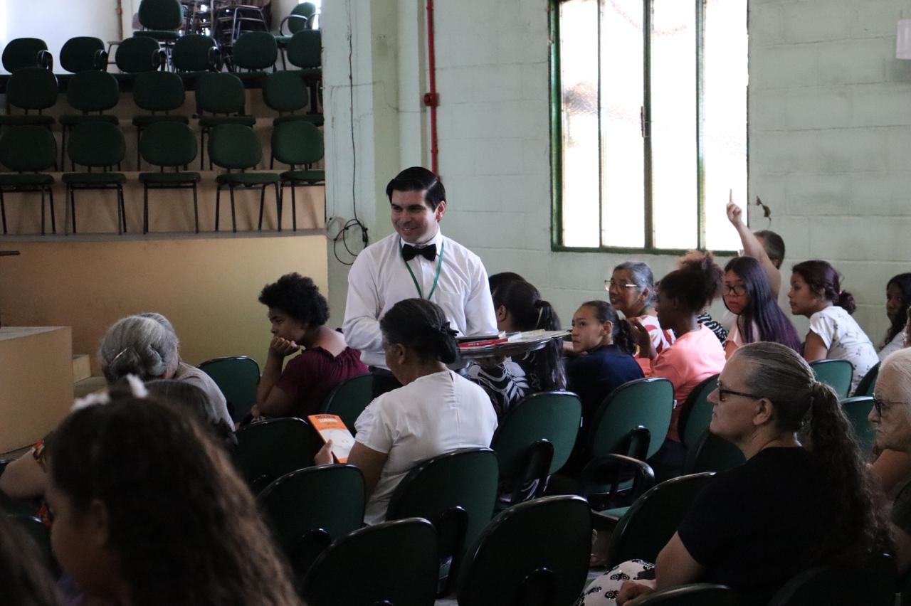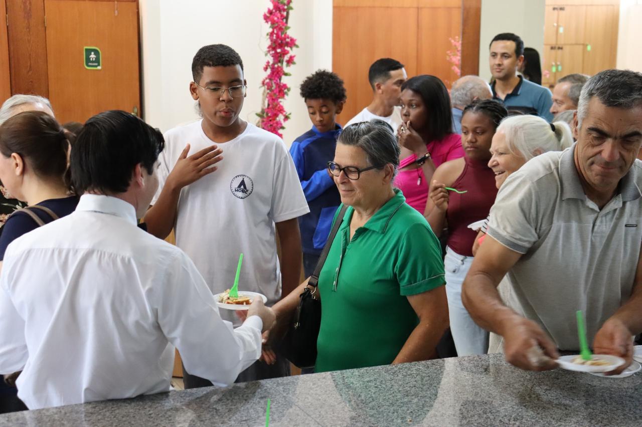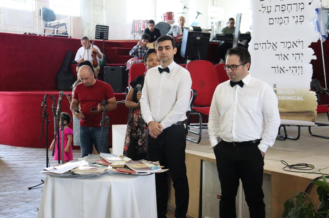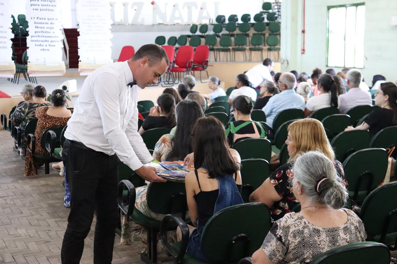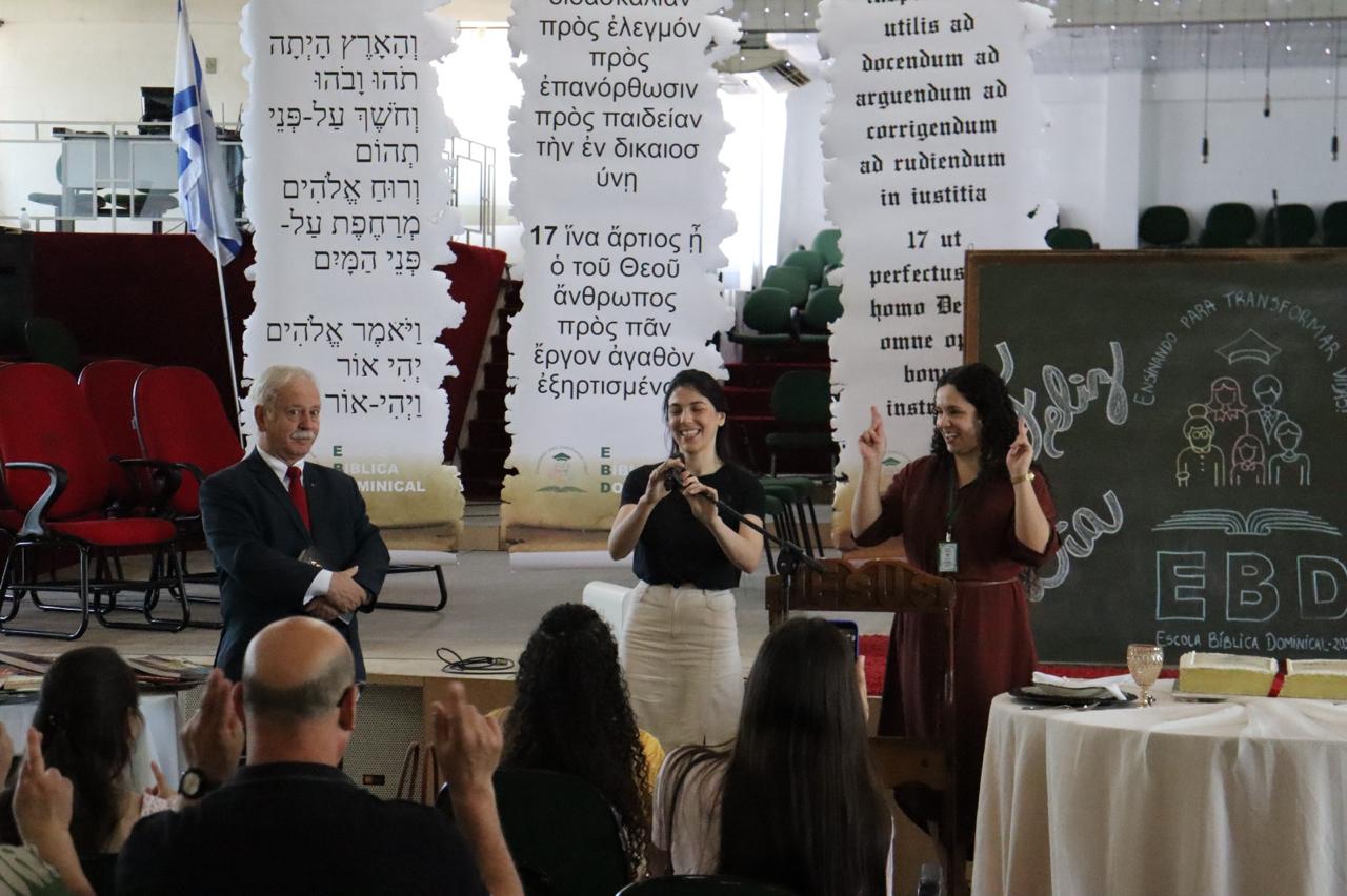 Na continuação, o versículo lema da EBD para o ano de 2025 foi apresentado aos irmãos em português, inglês, hebraico, espanhol e LIBRAS. No final, alguns irmãos, vestidos como garçons, passaram bandejas com livros cristãos para que os presentes pudessem escolher um livro que foi doado para quem estava na escola bíblica dominical. No salão da igreja, após a programação, foi servida uma fatia de um delicioso bolo aos irmãos que compareceram.