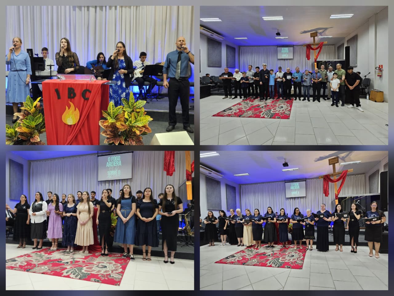O culto seguiu com um momento especial: a apresentação do pequeno Matteo, filho do casal Moisés e Renata, da IBC Alvorada. A igreja se uniu em oração, dedicando a criança ao Senhor. Em seguida, os departamentos Masculino, Feminino, Mocidade, Grupo Elion e novamente o Grupo Baluarte conduziram a congregação em louvores. Outro destaque da noite foi a consagração do novo violão adquirido pela irmã Querlen, que dedicou o instrumento ao serviço do Senhor.