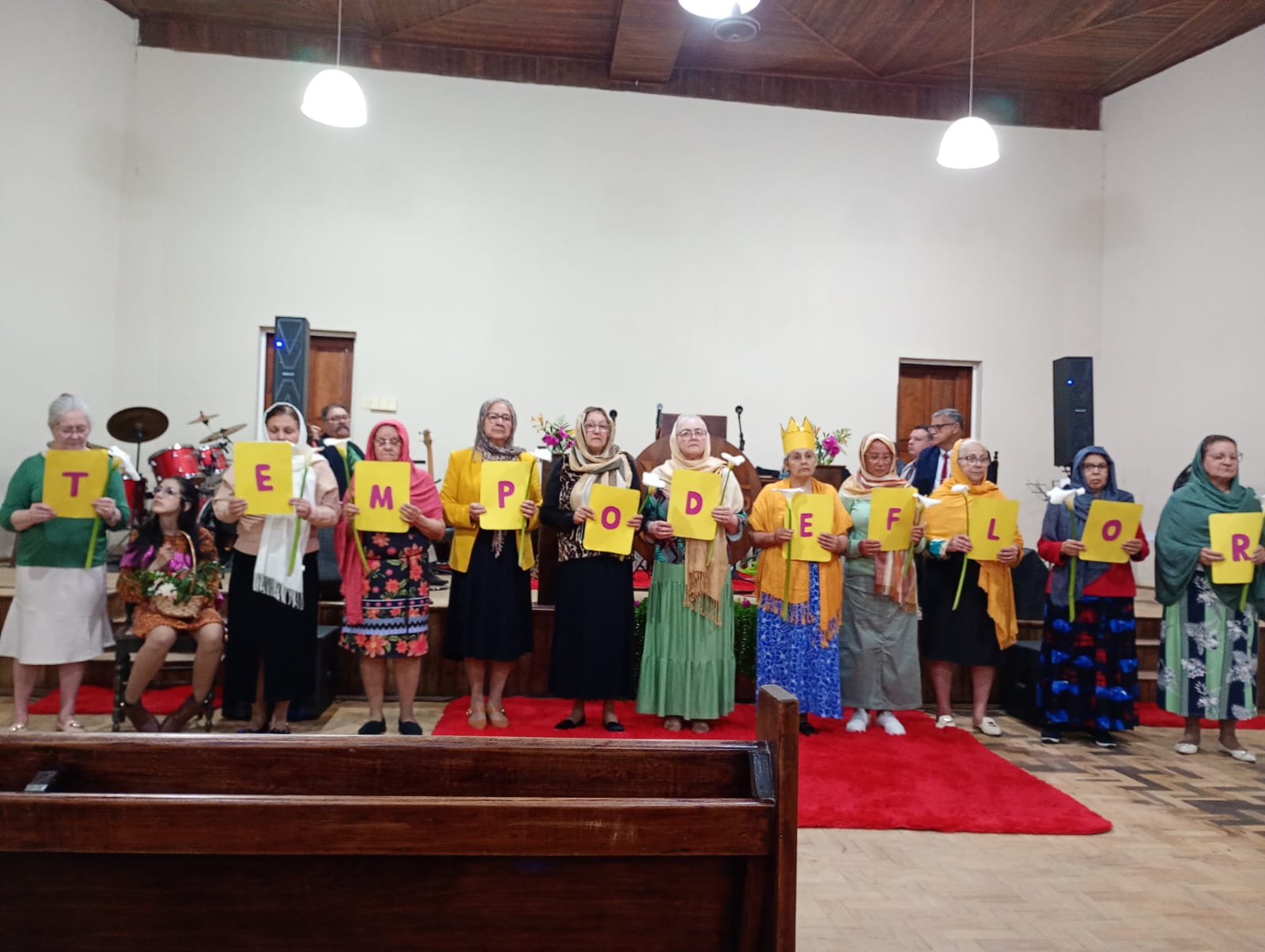Durante o culto, o Departamento Feminino apresentou uma peça teatral com o tema “Tempo de Florir”, enfatizando a renovação, a paciência e a persistência na caminhada cristã.
