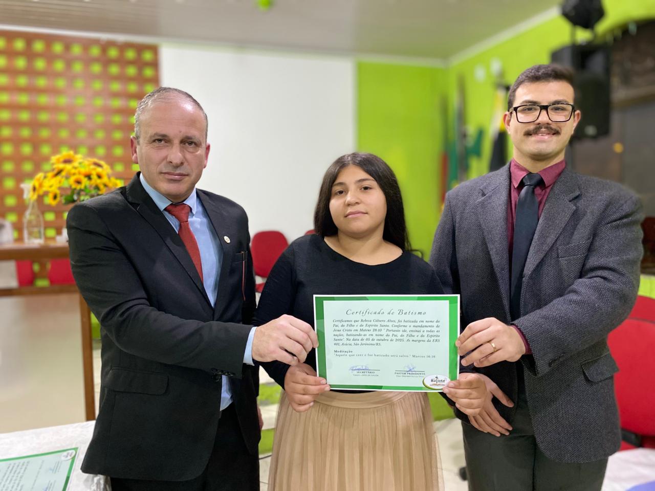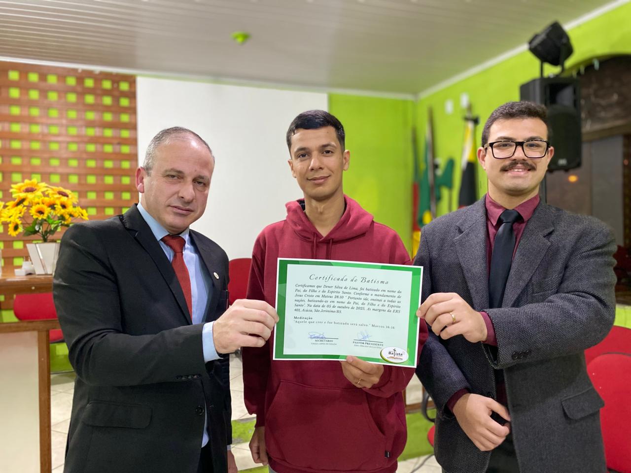 Durante o culto de ceia, realizado na terça-feira, dia 7 de outubro, Dener e Rebeca receberam seus certificados de batismo, formalizando o compromisso assumido diante de Deus e da comunidade de fé.