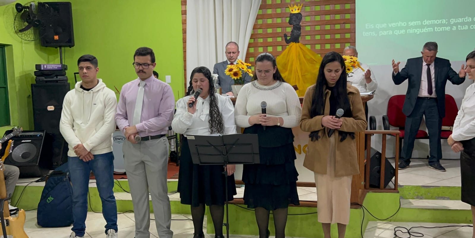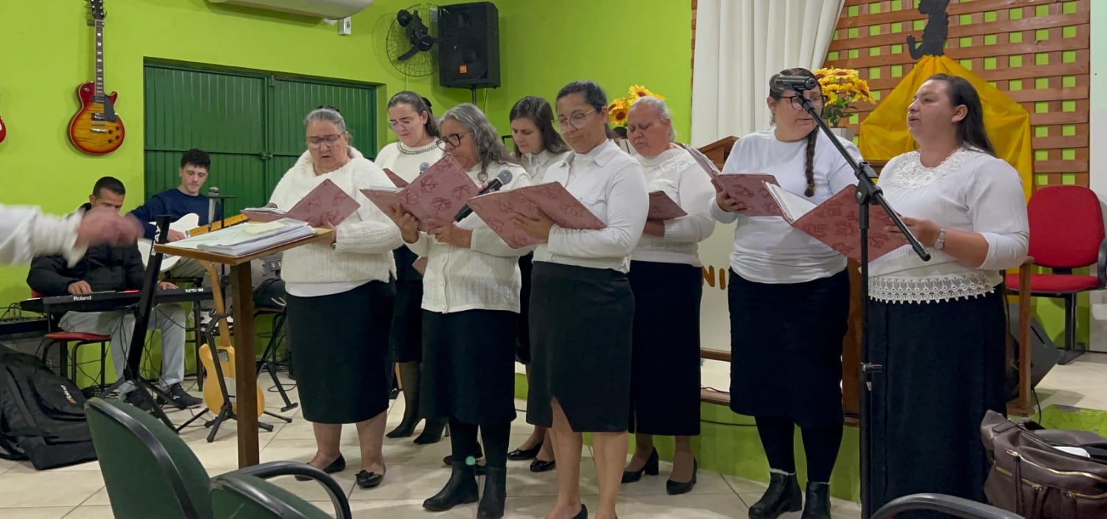 O coral de mulheres do Departamento Feminino participou ativamente dos momentos de louvor, juntamente com o grupo local Aliança Inabalável, que cooperou com cânticos que emocionaram os presentes.