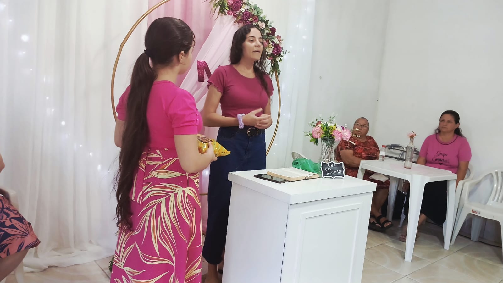 As atividades tiveram início às 16h, no salão social da igreja, com a realização de um Chá de Mulheres. Durante o encontro, foram realizadas dinâmicas conduzidas pela irmã Fabiane Vieira e pela convidada especial, irmã Elimar, da Igreja Batista Conservadora de Pelotas. Na ocasião, a irmã Elimar também ministrou uma palestra baseada no texto bíblico 2 Coríntios 2:15, com o tema “O bom perfume de Cristo”, trazendo uma mensagem de Deus às participantes.
