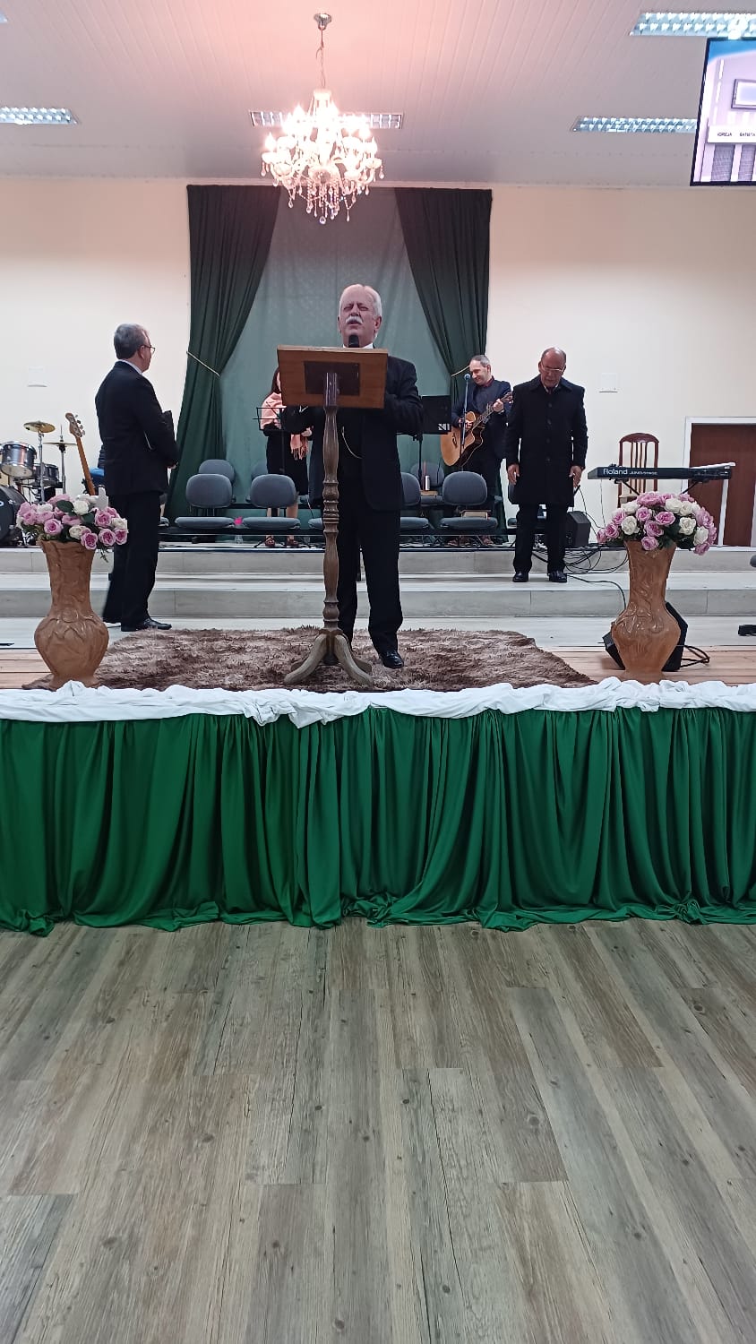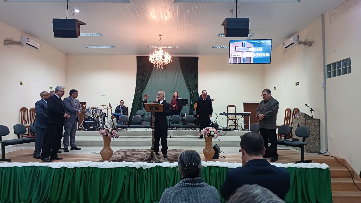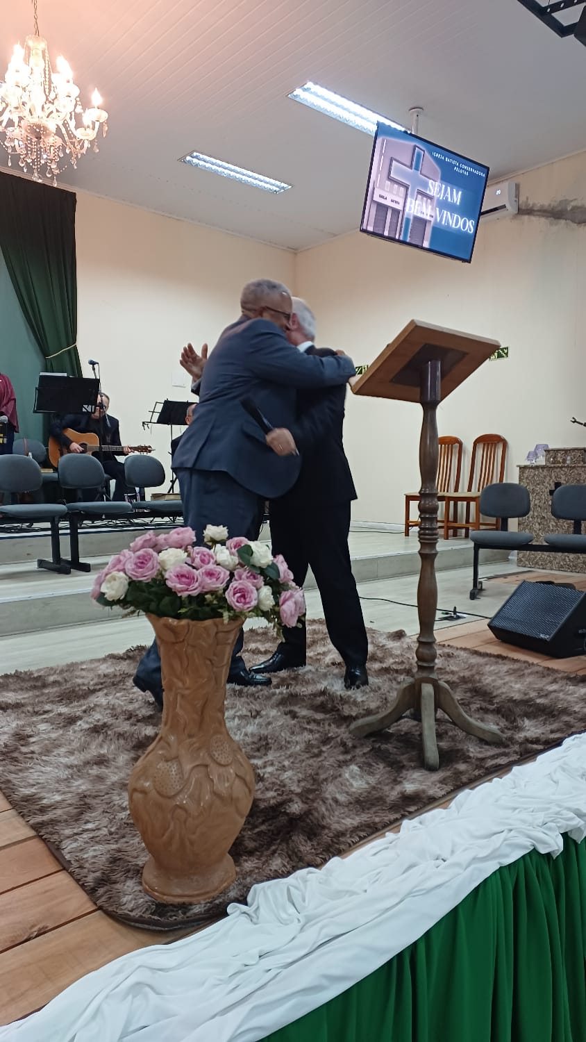 Em seu momento de fala, o Pastor Gideão compartilhou que, por 40 anos, orou pela vida de seu amigo pessoal, irmão Gilmar Mesquita, até que ele aceitasse a jornada da fé com Jesus. Além disso, o Pastor Gideão lembrou da oportunidade que Deus lhe concedeu em batizar seu querido amigo Gilmar Mesquita na cidade de Bagé.