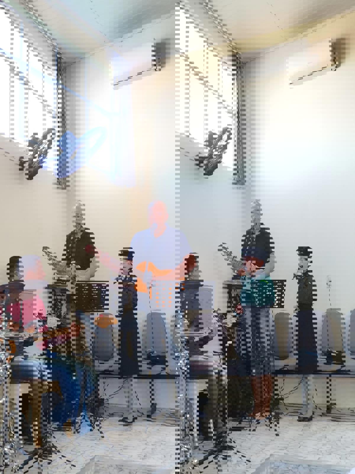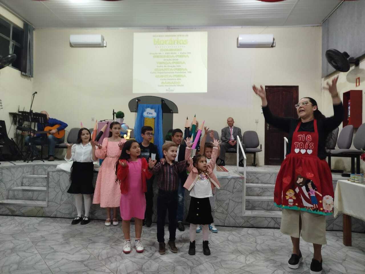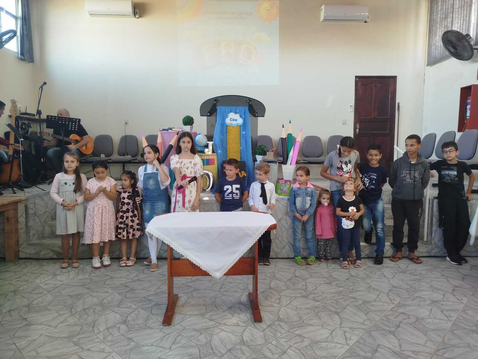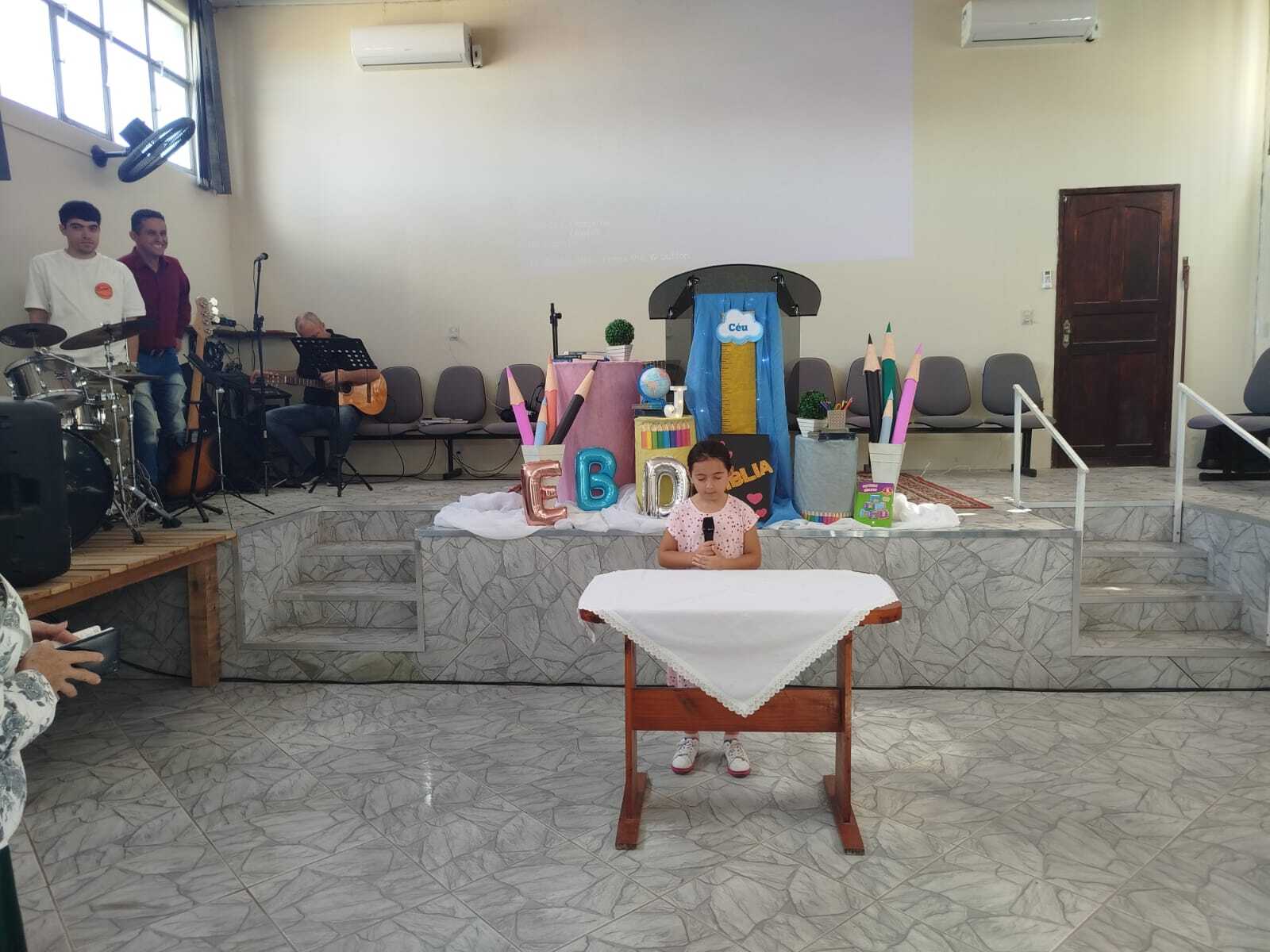 A EBD teve uma participação especial nos louvores dos Guerreiros de Cristo da IBC Canguçu. O culto de encerramento foi dirigido pela pequena Ana Witória da Silva, e a palavra introdutória foi proferida pelo pequeno Abrahão Moura dos Santos, que trouxe sua reflexão em João 3:16. Cooperaram nos louvores as classes, os membros locais, as professoras, os Guerreiros de Cristo e a pequena Maísa, que louvou ao Senhor com seu instrumento.