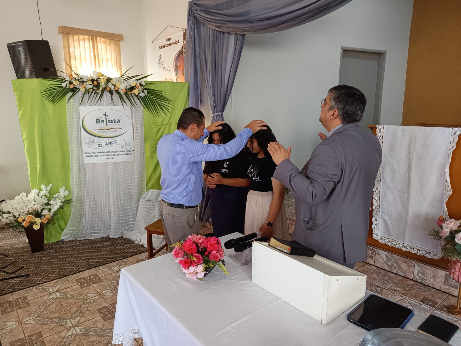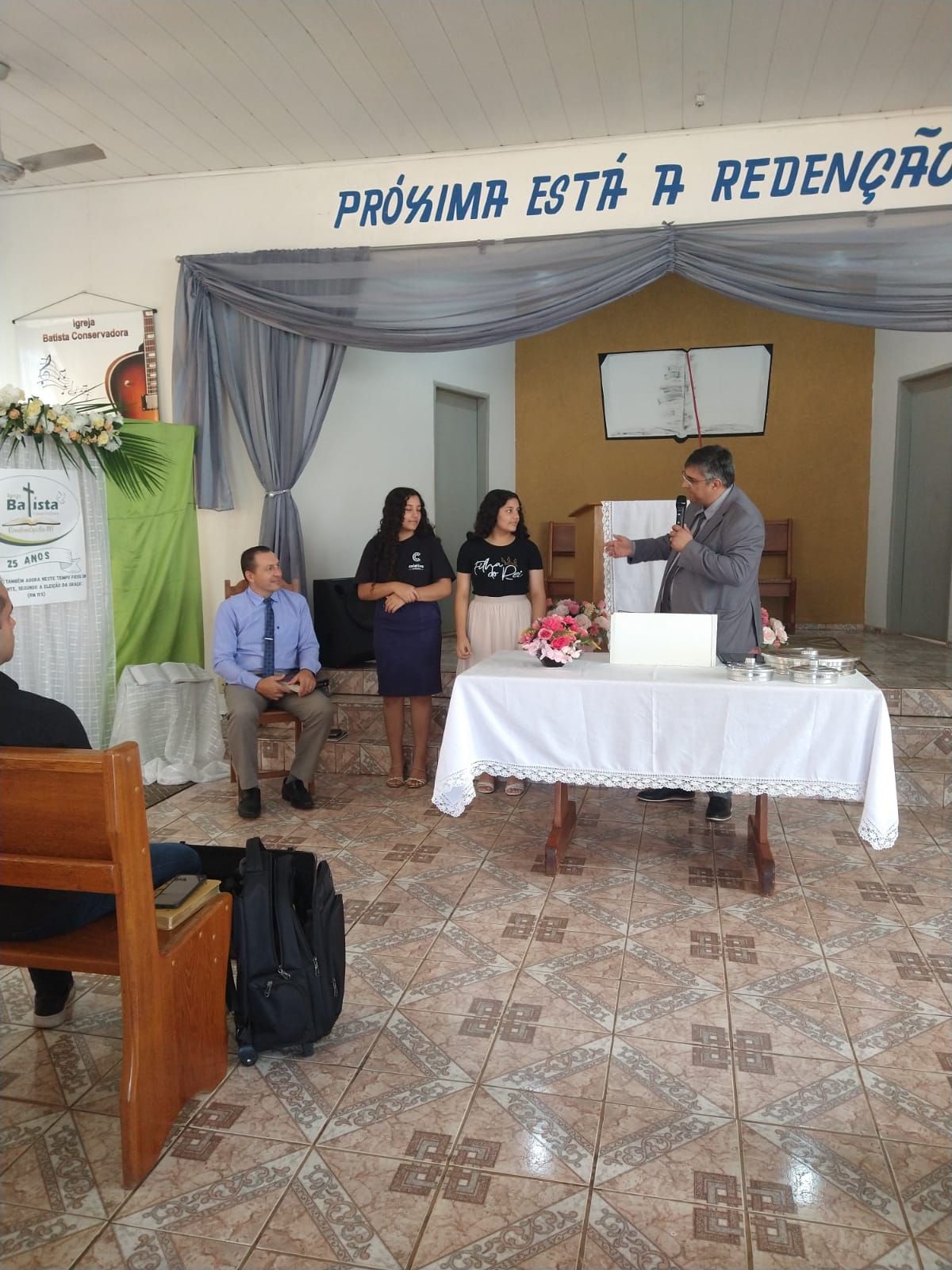 No sábado, dia 31/05, à noite, foi realizado o culto de abertura das comemorações, e após foi celebrado o batismo das gêmeas Anna Carla e Anna Carolina, filhas do Missionário João Paulo e Andiesca.