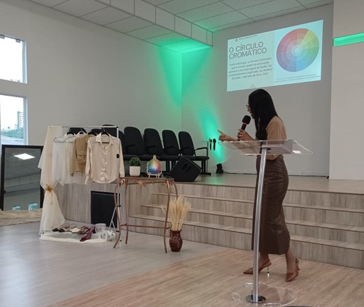 Com linguagem simples e envolvente, ela mostrou que é possível expressar a beleza interior através da aparência, de forma coerente com os valores cristãos. O momento também contou com ensinamentos sobre o círculo cromático e a combinação de cores, uma forma prática e leve de aprender sobre estilo e autoconhecimento.