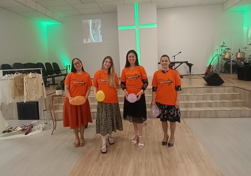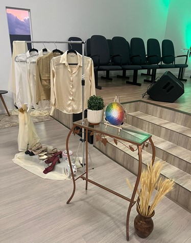 Para esse encontro, a igreja foi cuidadosamente decorada para esse momento especial. O cenário incluía peças de vestuário, calçados e elementos simbólicos que destacavam o tema da moda e da imagem pessoal, criando um ambiente acolhedor e inspirador para as mulheres presentes.