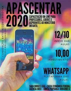 No dia 12 outubro será lançado o curso on-line para professores e aspirantes à Escola Bíblica Dominical, promovido pelo Projeto Apascentar, e será ministrado pelo aplicativo do Whatsapp. O conteúdo do curso abordará: